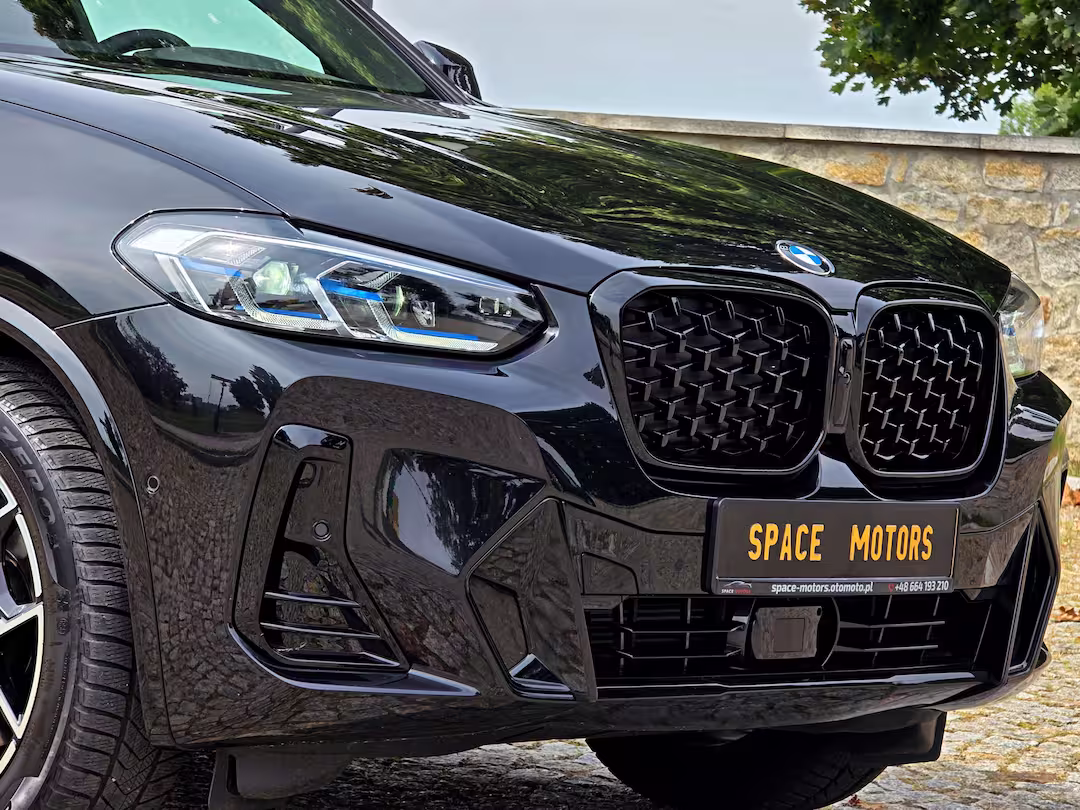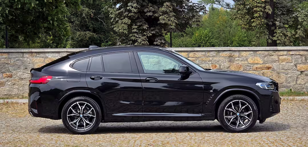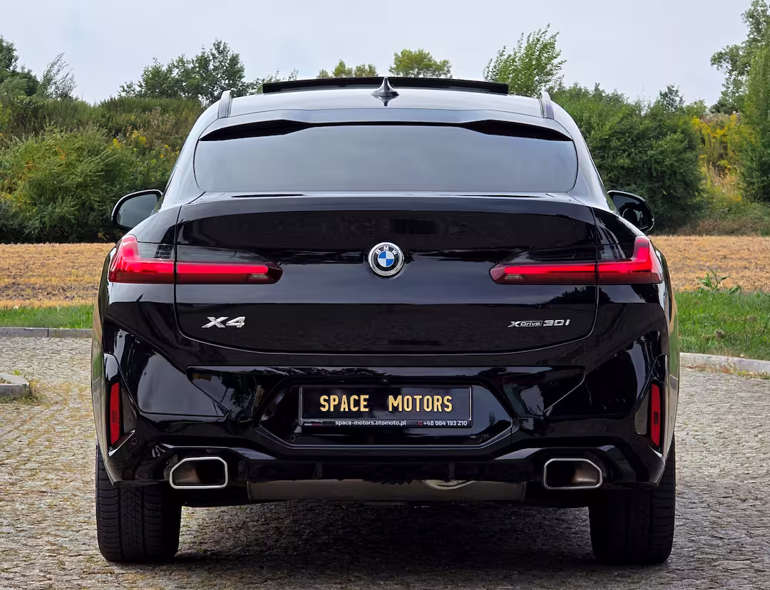 BMW X4 30i xDrive z roku produkcji 2024 w kolorze Carbon Schwarz Metallic.